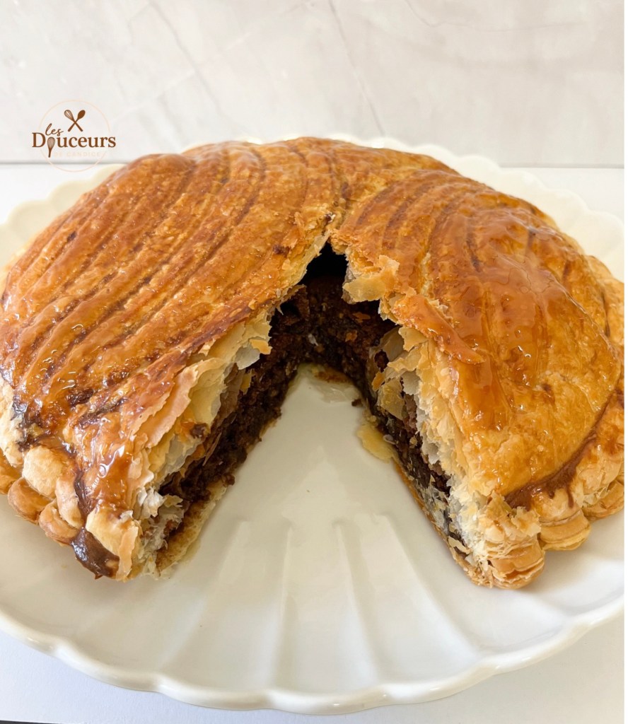 Sous son feuilletage doré et délicatement décoré , la galette renferme une crème fondante , parfumée à l’amande et enrichie de chocolat . La texture est soyeuse , enveloppante avec ce petit supplément de caractère apporté par le chocolat . Le contraste entre le croustillant du feuilletage et la douceur de la garniture créé une harmonie qui séduit autant les amateurs de tradition que les passionnés de chocolat .