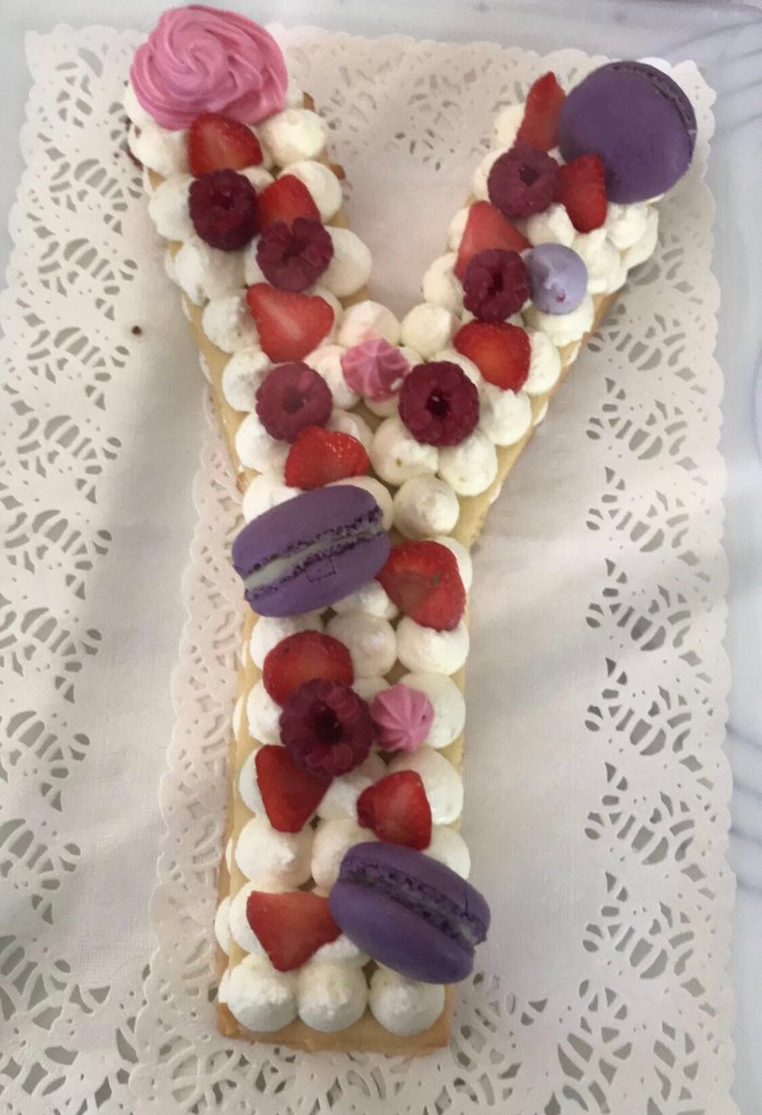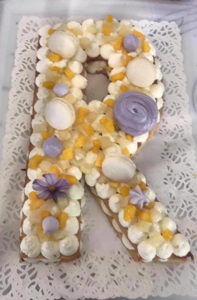 Je vous propose une recette de lettre cake facile, un gâteau en forme de lettre hyper tendance en ce moment . Il est souvent réalisé à l’occasion d’un anniversaire. J’ai opté pour une recette légère et aérienne et du citron vert pour apporter de la fraîcheur. Il est composé de 2 étages de biscuits peu épais et de la même forme , d’une garniture chantilly mascarpone au citron vert , décoré de fruits frais j’ai rajouté des meringues et des macarons et des fleurs en azyme .