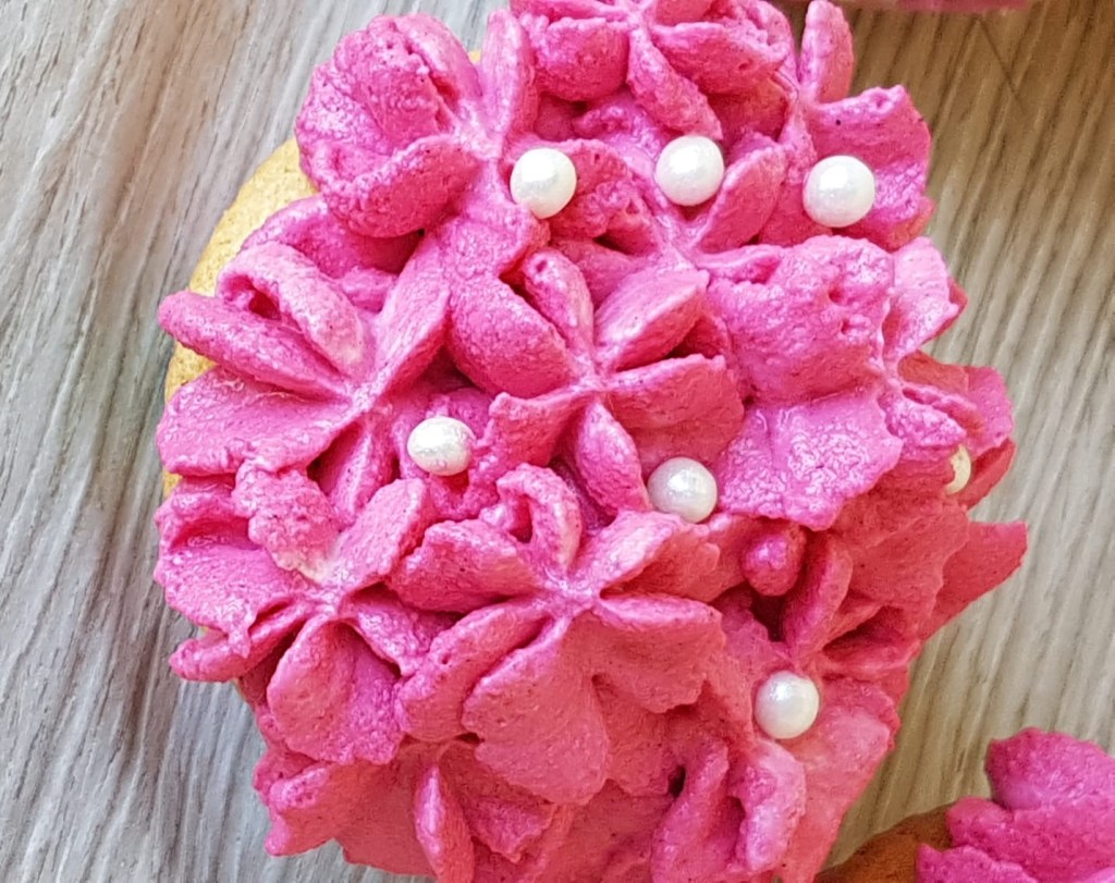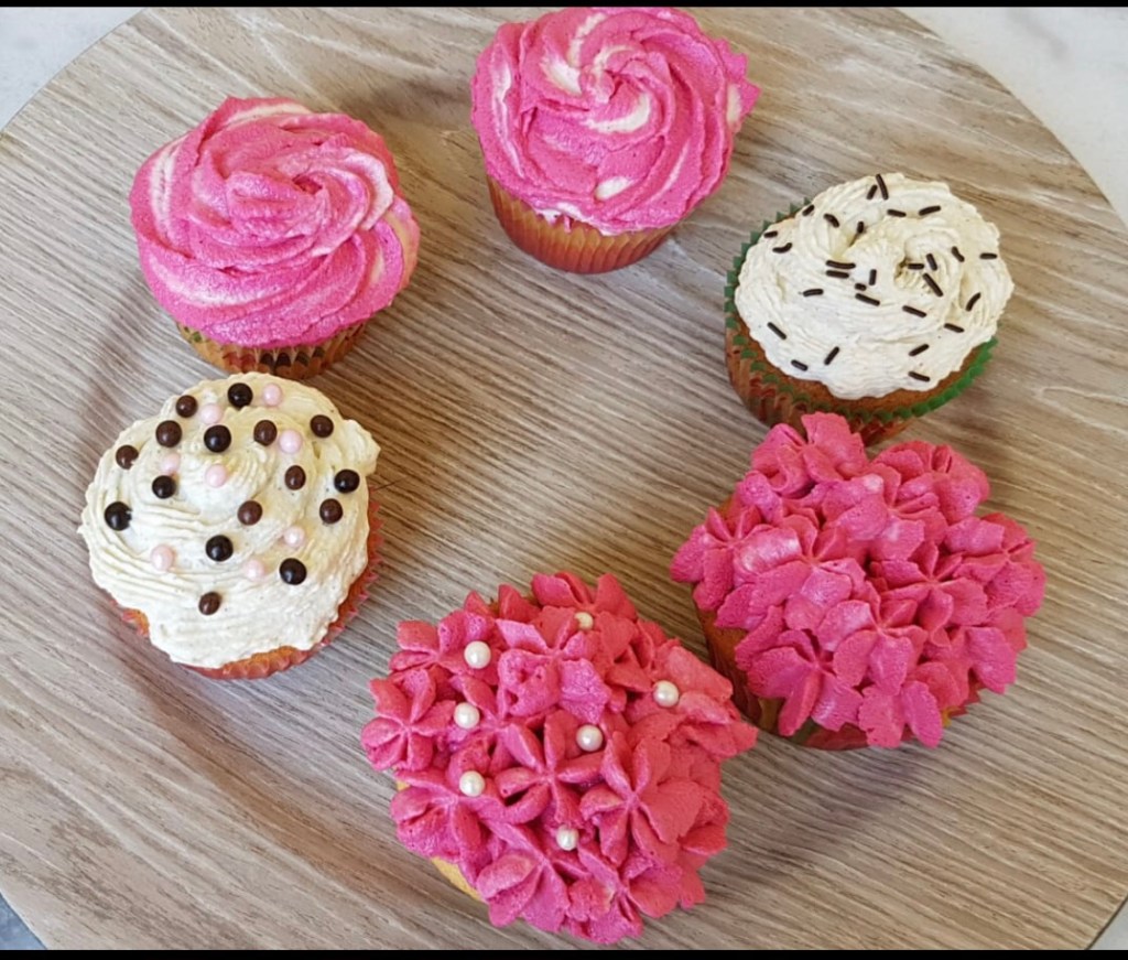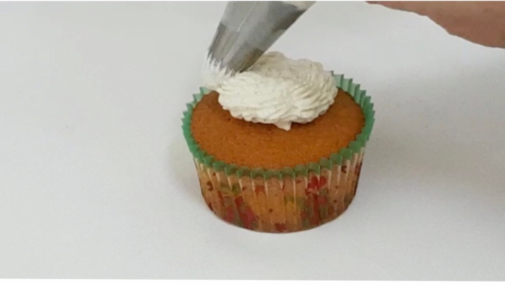 Prenez votre poche à douille à la perpendiculaire et mettez vous au dessus de votre CUPCAKE. A partir du centre dessinez un escargot en faisant des spirales tout autour jusqu’à atteindre le bord du cupcake .