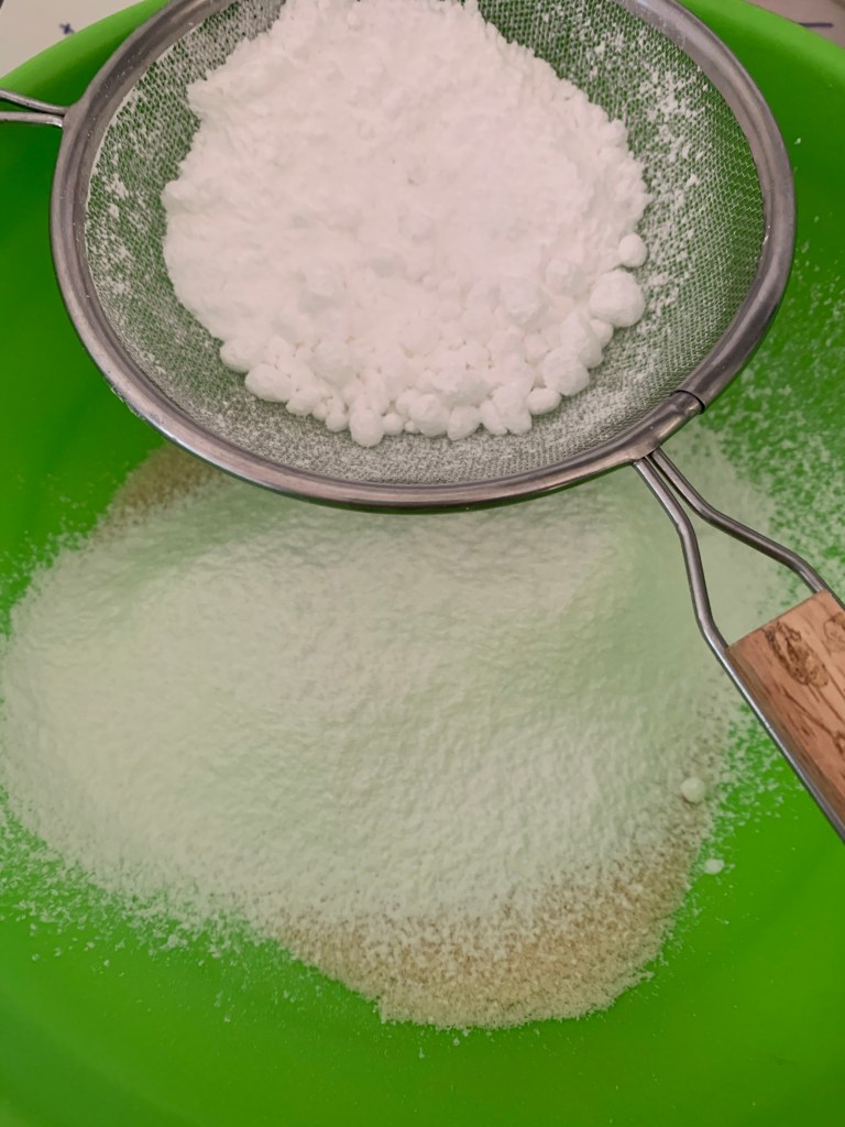 Dacquoise: Dans un saladier tamiser le sucre glace et la poudre d’amande ou de noisette . Mélanger .
