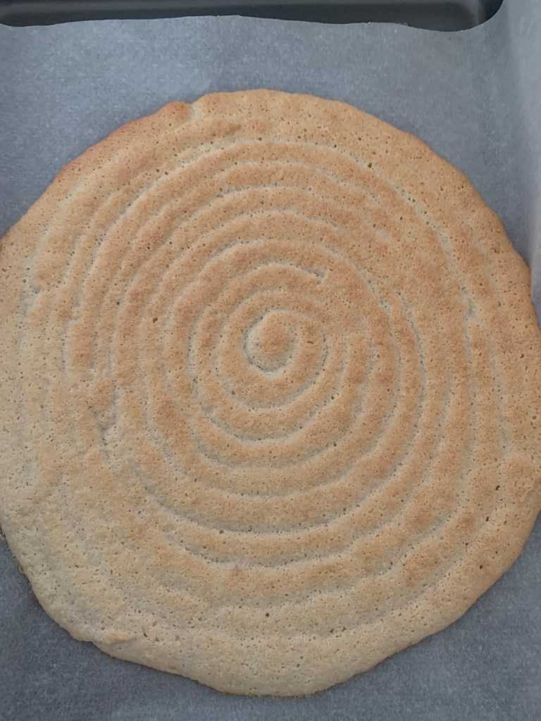 Sur une plaque munie de papier cuisson étaler la pâte (un peu plus grand que votre moule ou cercle). J’ai choisi de la réaliser à l’aide d’une poche et pocher en escargot .