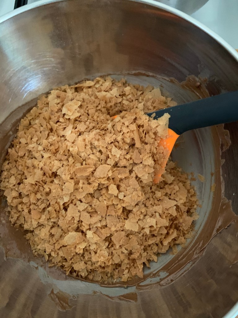 Écraser les crêpes dentelles et les ajouter au chocolat fondu . mélanger rapidement car le chocolat se fige vite .