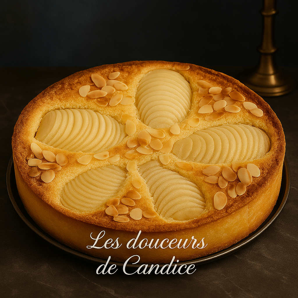 80g de beurre , 80g de sucre,80g de poudre d’amandes , 2 oeufs , 1 c à c d’extrait d’amande amère , 5 demi poires au sirop . Amandes effilées pour la décoration