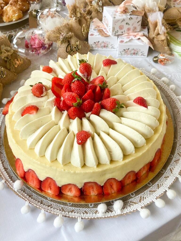 Pour le décor j’ai opté pour une ganache montée à la vanille pochée à la douille St honoré et de fraises.