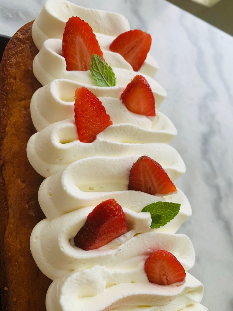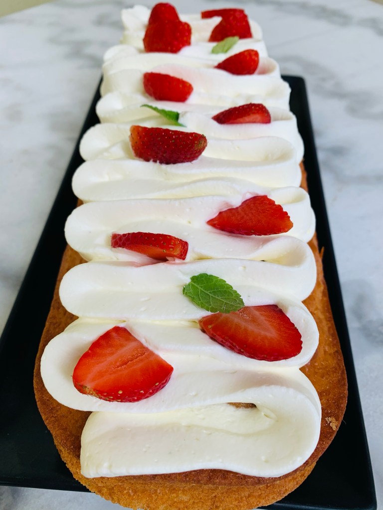 Aujourd’hui je vous propose un gâteau au yaourt aromatisé au citron sublimé par une chantilly mascarpone à la menthe et décoré de fraises . La menthe se marie parfaitement avec les fruits rouges .