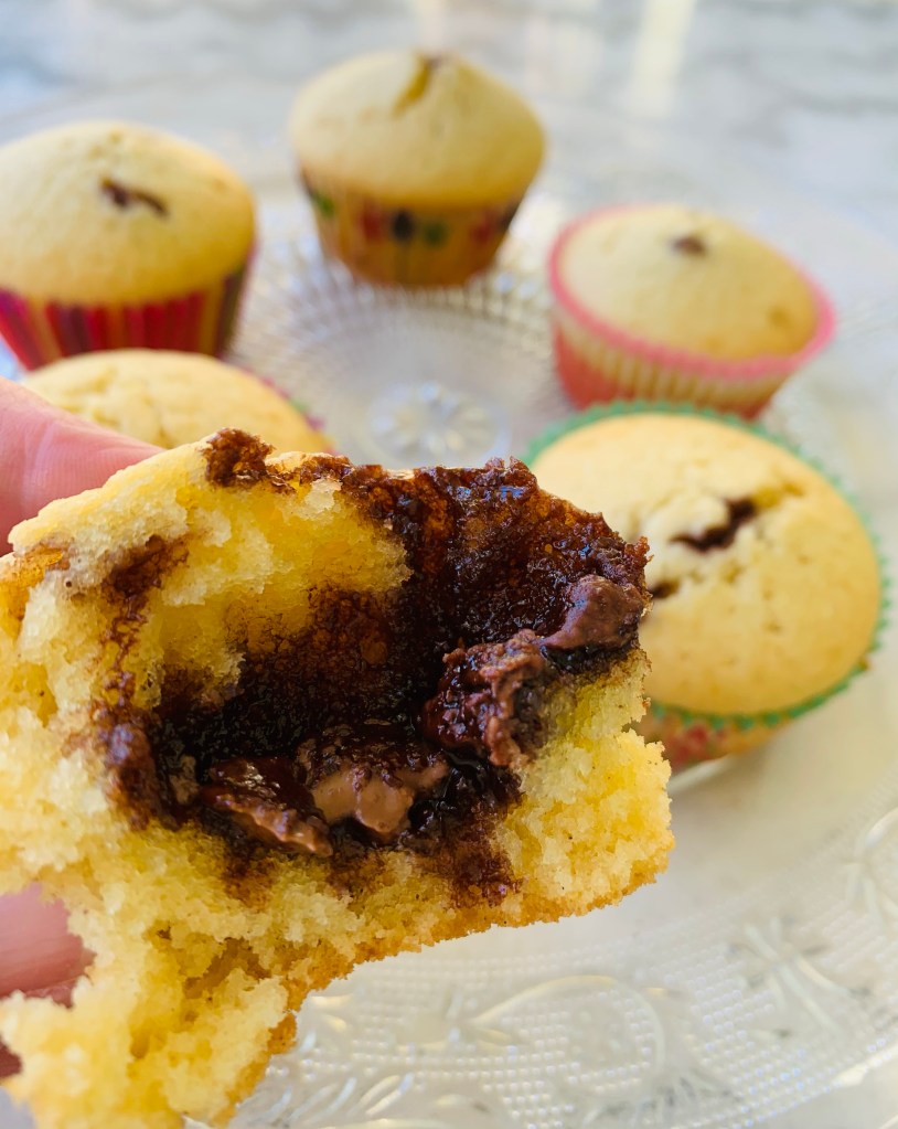 Ingrédients pour 8 beaux muffins : 200g de farine , 100g de sucre, 6g de levure chimique, 2 œufs, 120g de lait, 100g de beurre fondu, 1 c à c de vanille en poudre , pâte à tartiner .