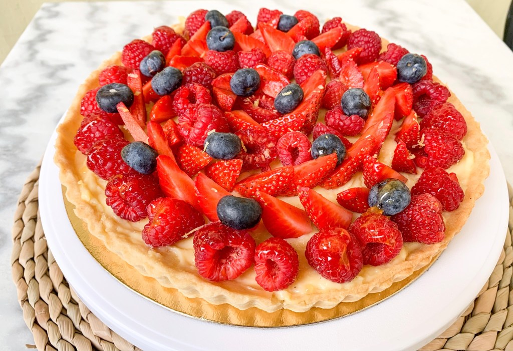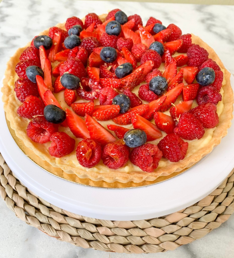 Montage : Fouetter la crème pâtissière pour la détendre . Étaler la crème sur votre fond de tarte. Disposer les fruits à votre convenance .