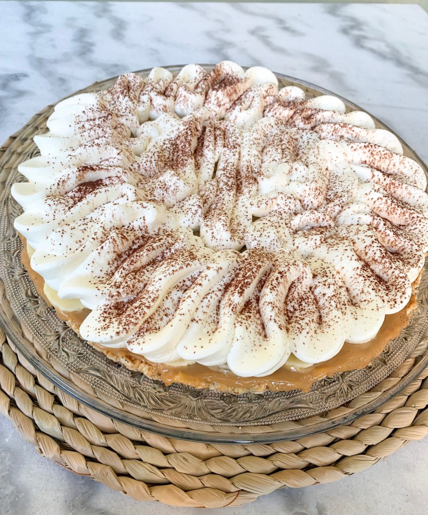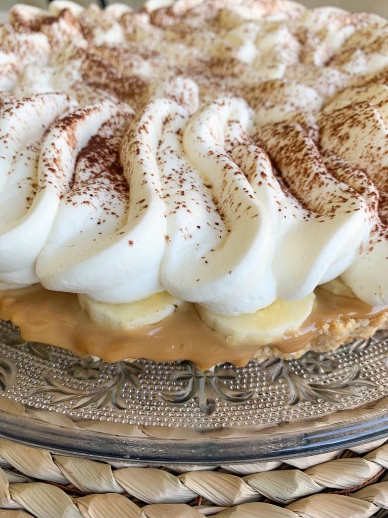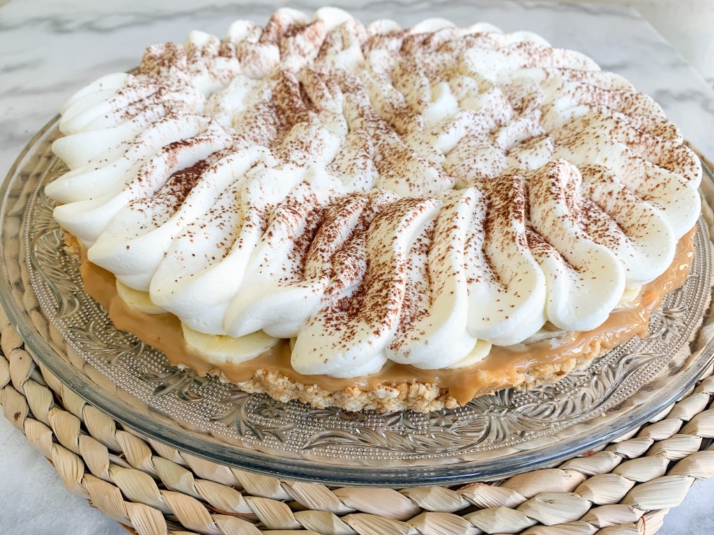 Une pâtisserie anglaise composée d’un biscuit , de confiture de lait , de bananes , le tout surmonté d’une généreuse couche de chantilly .