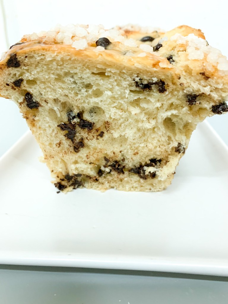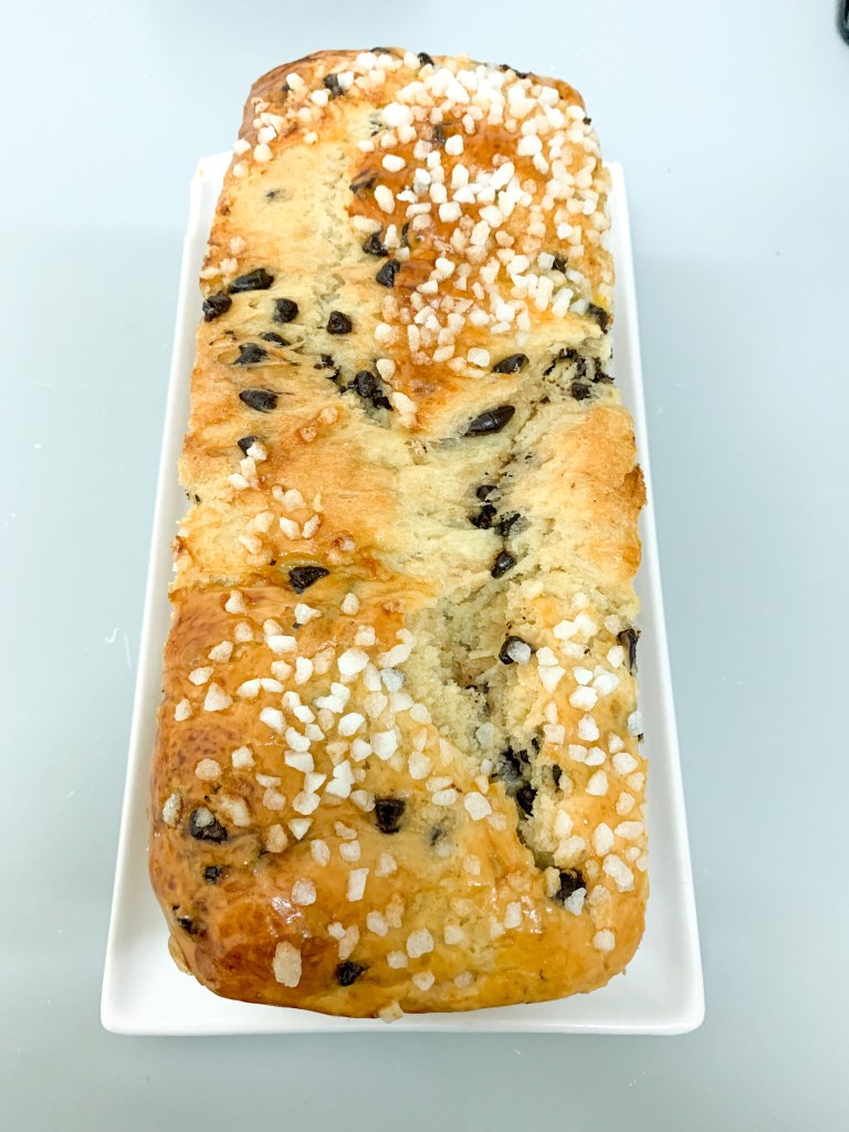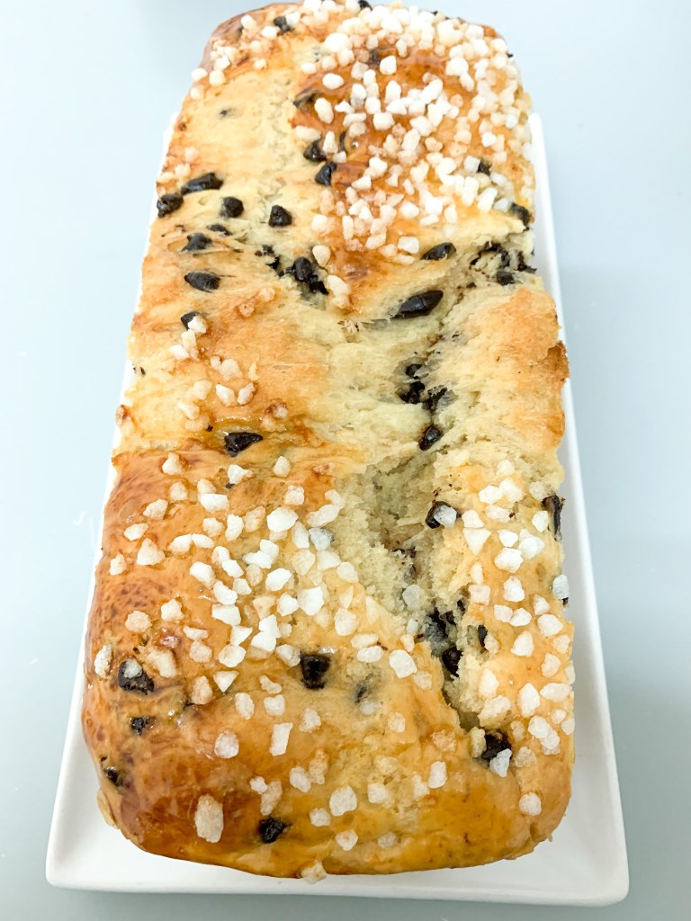 Ingrédients : 300g de farine, 12g de levure de boulangerie, 1 œuf, 150ml de lait, 70g de sucre, 60g de beurre, 1/2 c à c de sel, 100g de pépites de chocolat, beurre pour le moule, 1 jaune d’œuf+1 c à c de lait pour la dorure , sucre perlé (optionnel)