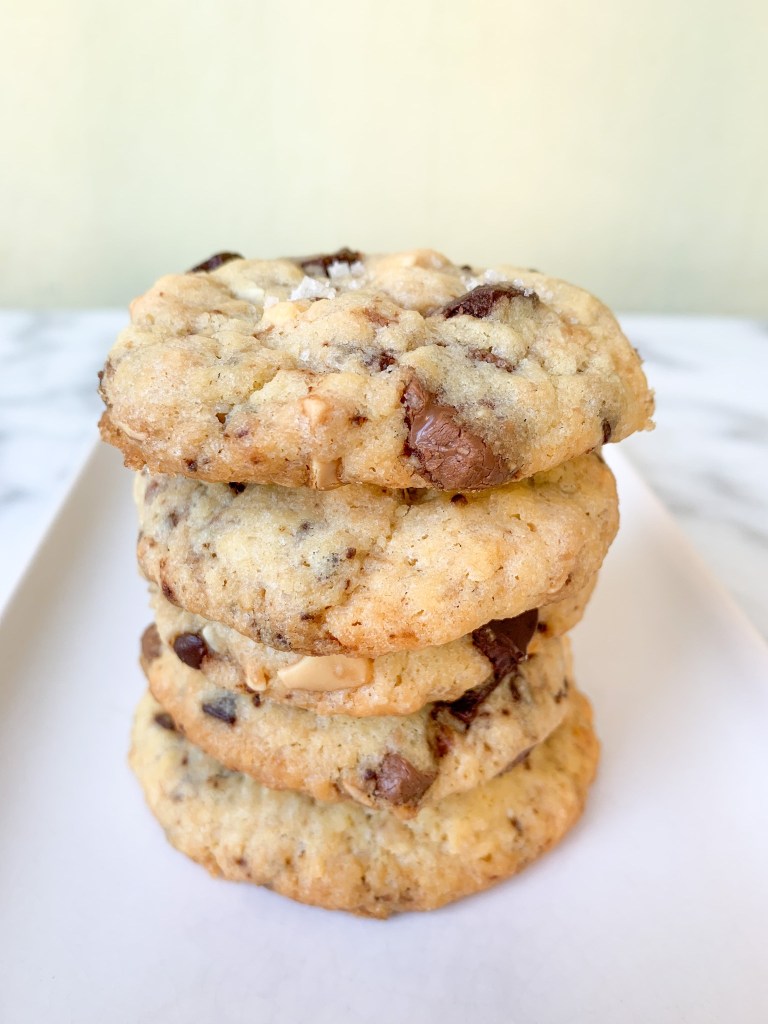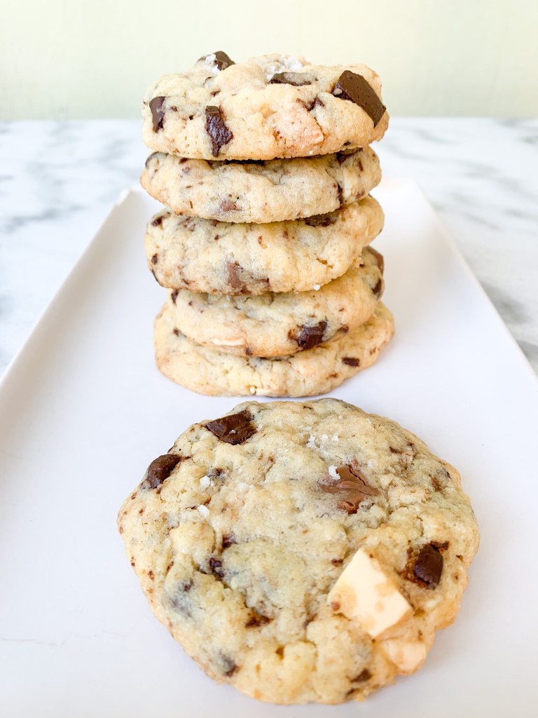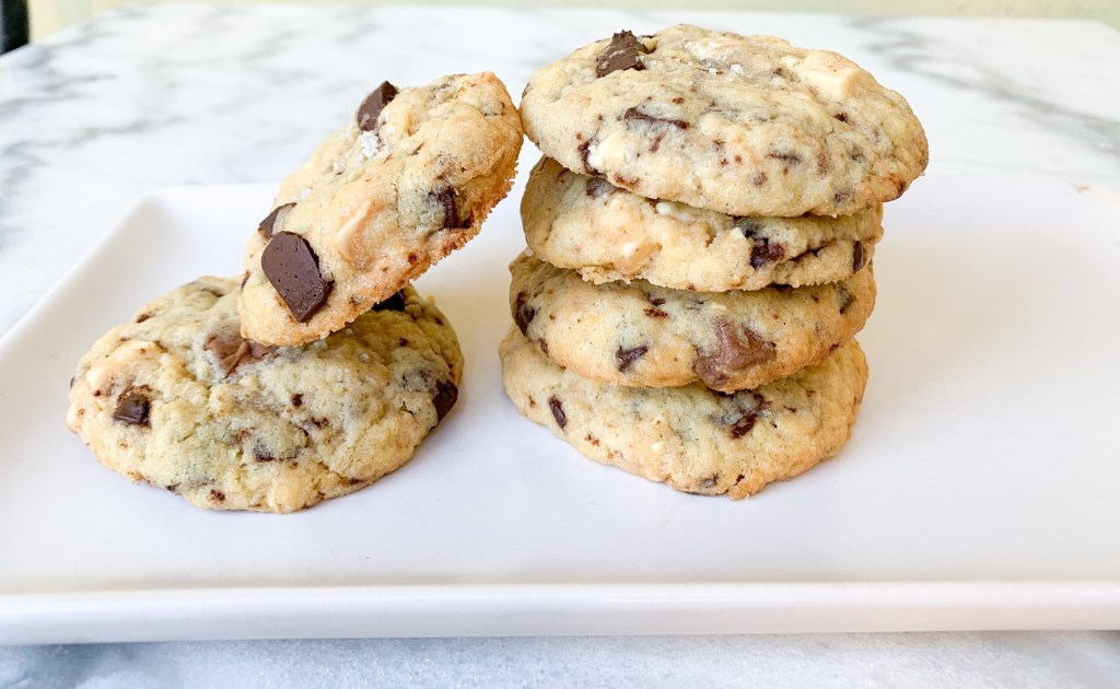 50g de sucre, 50g de cassonade, 100g de beurre demi-sel, 1 œuf, 170g de farine, 3,5g de levure chimique, 75g de chocolat noir, 75g de chocolat au lait, 75g de chocolat blanc , 1 c à c de fleur de sel .