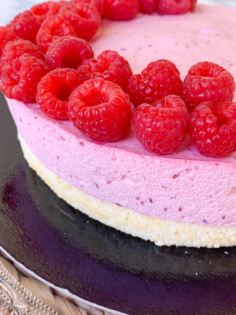 Il est composé d’un biscuit moelleux amande , d’une mousse de framboise et décoré de framboises fraîches .