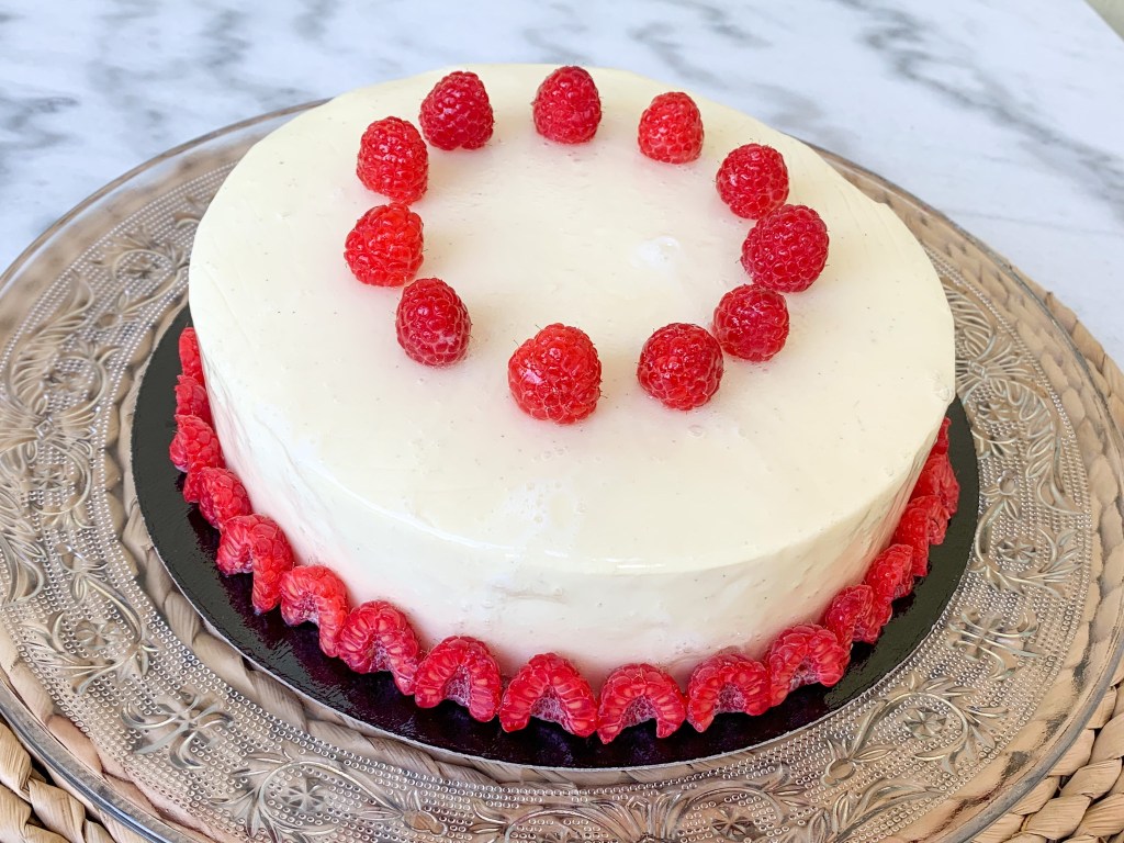 Placer votre entremet sur un plat de service , déposer tout autour des demi framboises .