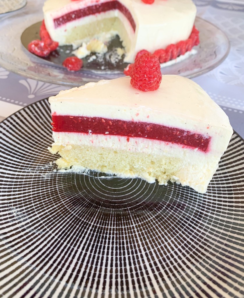 Montage : Sortir l’insert du congélateur. Découper le biscuit madeleine à l’aide d’un cercle de 18cm. Filmer le bas de votre cercle de 20cm et le déposer sur un plat . Chemiser l’intérieur du cercle de rhodoid (facultatif). Couler la moitié de la mousse à la vanille dans le cercle , déposer l’insert à la framboise et appuyer légèrement . Couler l’autre moitié de mousse à la vanille puis déposer le disque de biscuit . Lisser la surface et réserver au congélateur toute la nuit .