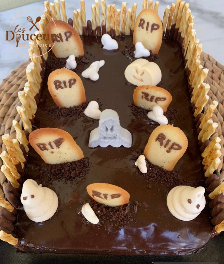 Quand Halloween frappe à la porte , il est temps de mêler frissons et gourmandises ! Ce gâteau cimetière aussi effrayant que fondant , est une création ludique qui ravira petits et grands . Sous sa ganache brillante se cache un moelleux au chocolat intense , décoré de langues de chat tombales , de fantômes meringués et de petits os croustillants . Une mise en scène fun et facile à réaliser , parfaite pour un goûter ensorcelé .