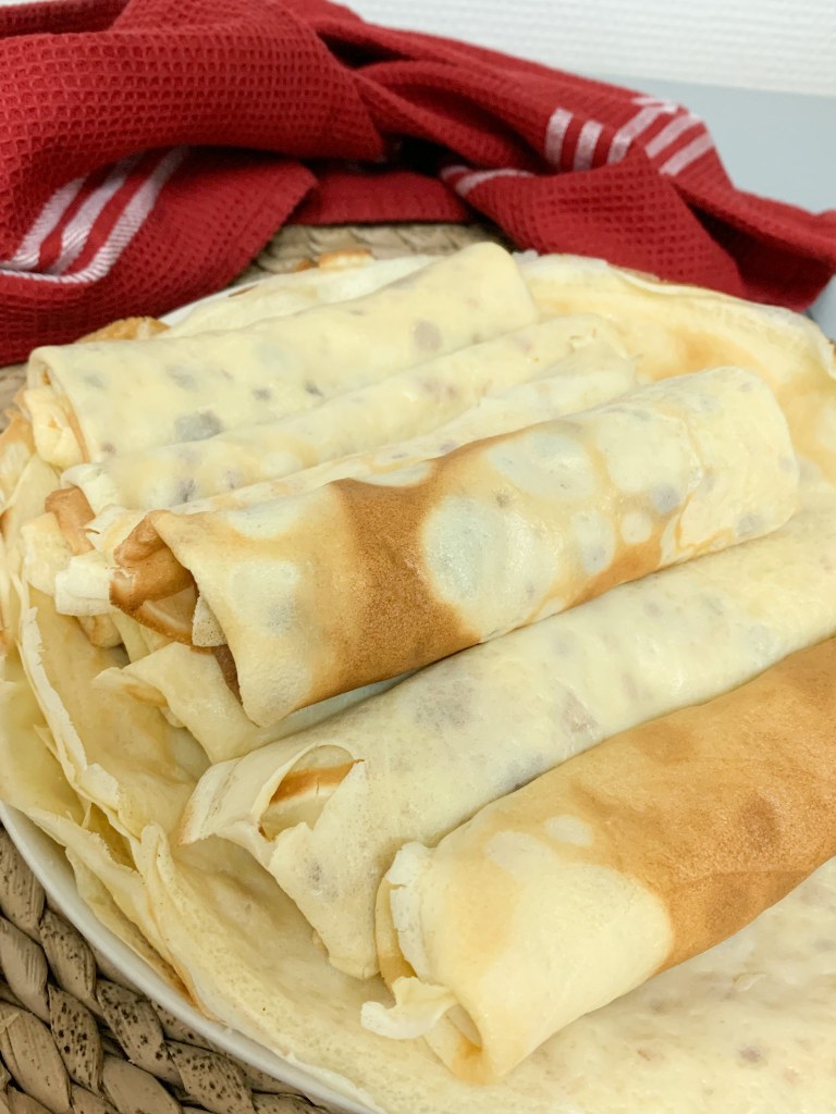 Ingrédients pour environ 15 crêpes : 250g de farine, 40g de sucre, 1 pincée de sel, 4 oeufs, 40g de beurre fondu, 60cl de lait, 1 c à s d’eau de fleur d’oranger ou rhum (facultatif et au choix).