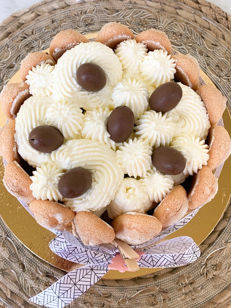 Chantilly : Dans un saladier fouetter la crème liquide bien froide en chantilly en incorporant le sucre glace et le chantifix . La transvaser dans une poche munie de la douille de votre choix puis décorer votre charlotte . Décorer de quelques œufs en chocolat.