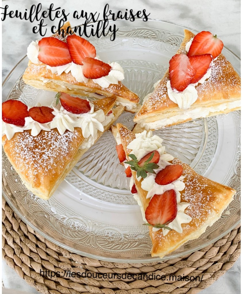 Montage : Couper chaque triangle en deux dans le sens de la longueur . Garnissez en 4 de chantilly, déposer des fraises coupées en morceaux puis déposer les autres pâtes sur le dessus . Saupoudrer de sucre glace .