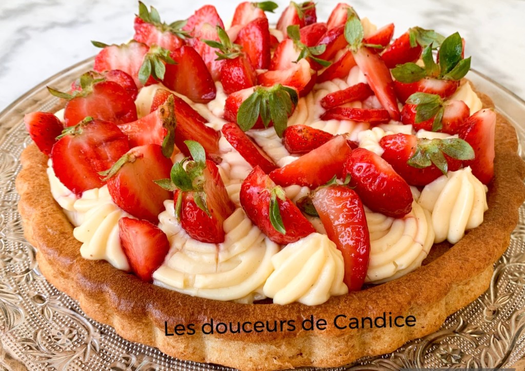 Une tarte moelleuse garnie de crème pâtissière et décorée de fraises . Un pur bonheur pour les papilles