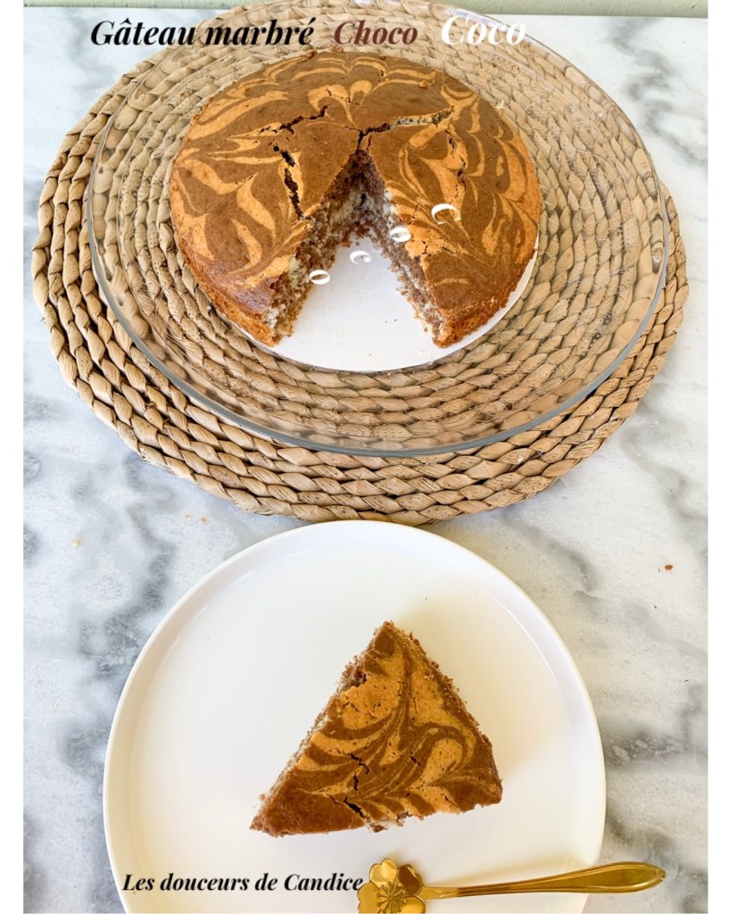 Pour un moule de 20cm : 1 pot de yaourt , 1 pot de sucre , 2 œufs , 3 pots de farine , 1/2 pot d’huile , 1 sachet de levure chimique, 3 c à s de noix de coco râpée, 1 c à s de cacao non sucré .