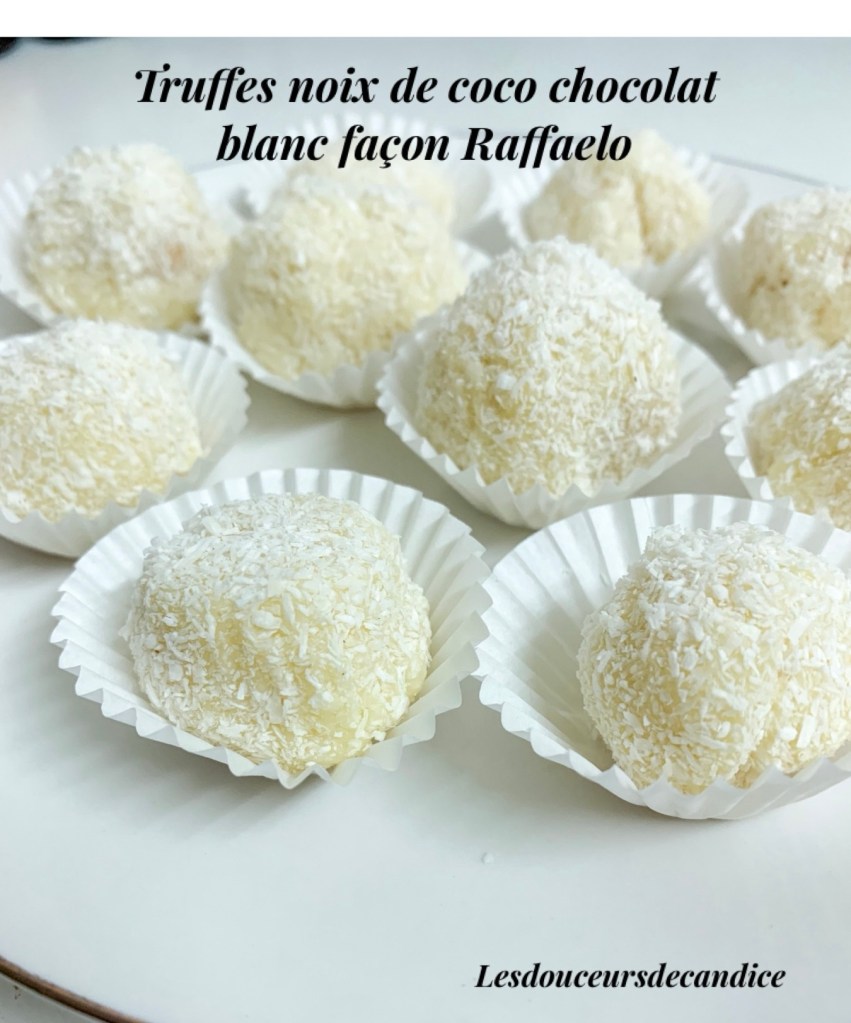 Fondantes et crémeuses au bon goût de chocolat blanc , de noix de coco et les amandes concassées qui lui donnent cette saveur qui nous fait rappeler les chocolats Raffaelo .