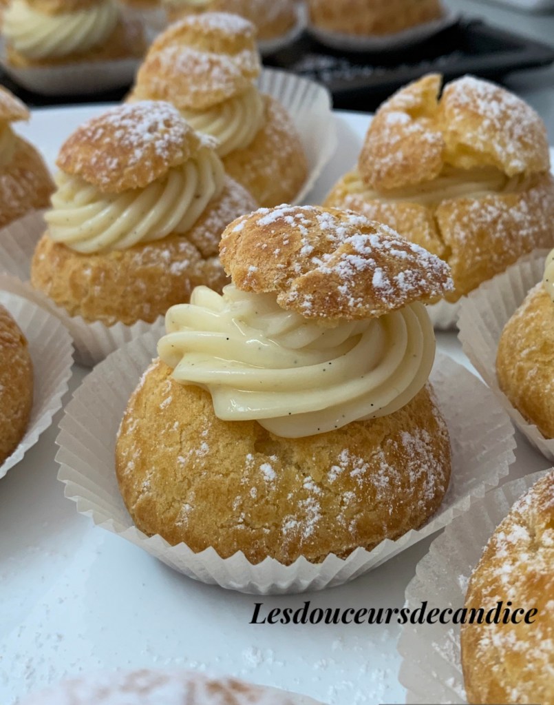 Mettre la crème pâtissière dans une poche munie d’une douille et garnir vos choux et poser la pâte coupée sur le dessus . Saupoudrer de sucre glace (optionnel )