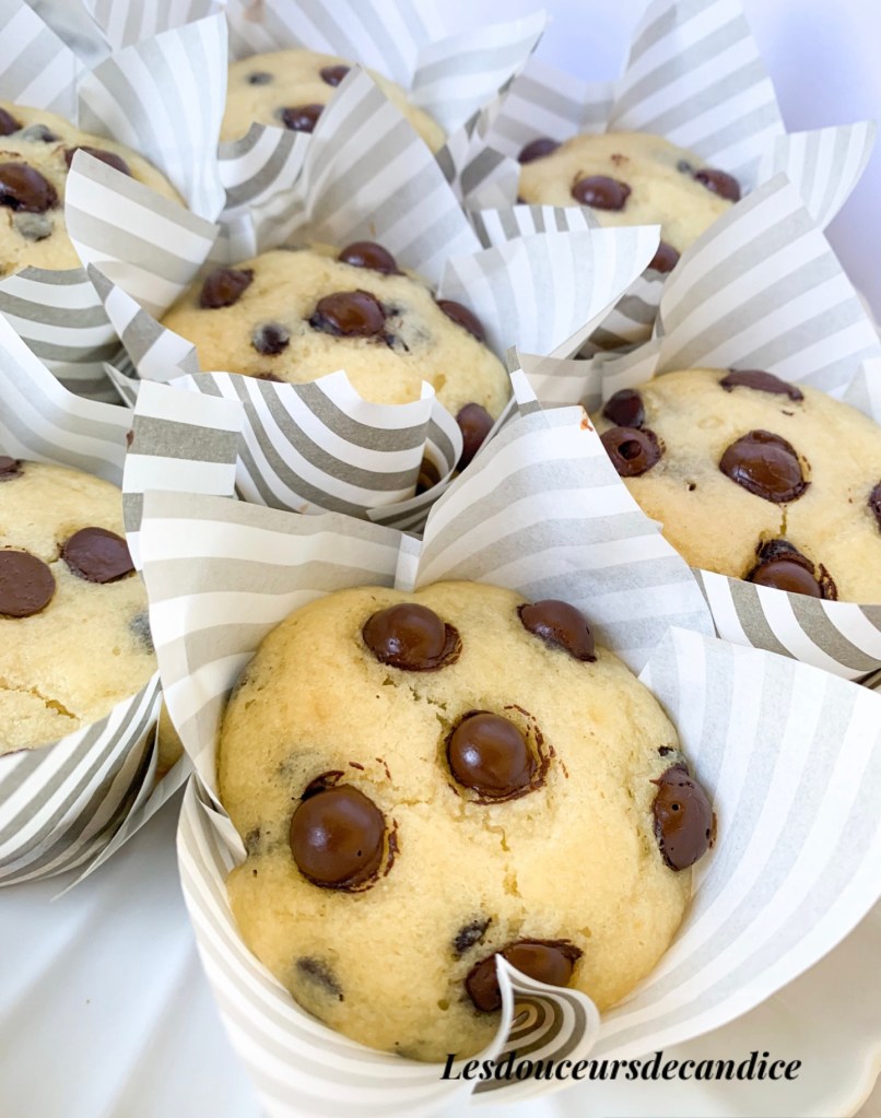 Verser la préparation dans des caissettes à muffins au 3/4 , parsemer de pépites de chocolat puis enfourner pendant 15 à 18 minutes selon la puissance de votre four et la grosseur de vos muffins .