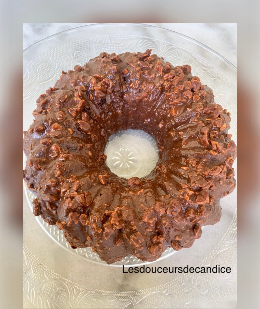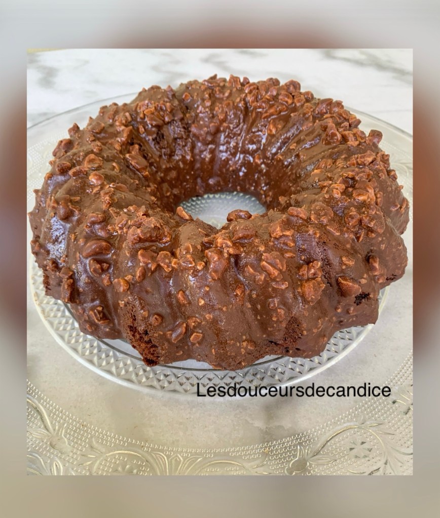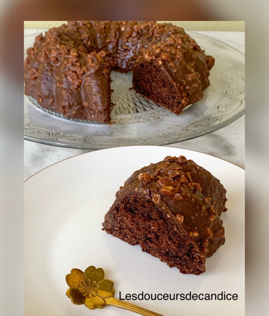 Pour un goûter gourmand je vous propose ce délicieux gâteau au chocolat recouvert de son glaçage rocher .