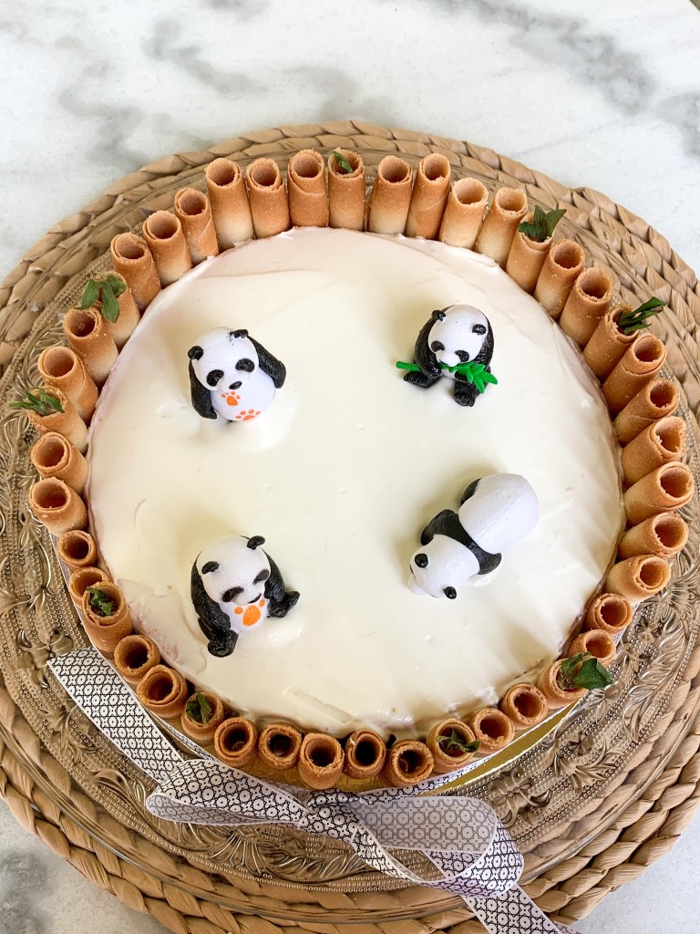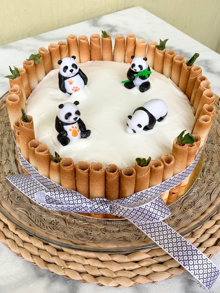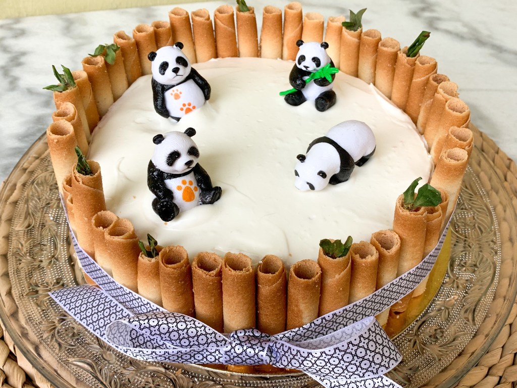 A l’occasion d’un anniversaire j’ai réalisé cet entremet composé d’un biscuit madeleine hyper moelleux, d’une mousse aux fraises surmonté de chantilly mascarpone . Pour le décor j’ai utilisé des cigarettes russes pour représenter les bambous. Les sujets ne sont pas comestibles car je dois vous avouer que je ne travaille pas la pâte à sucre car je ne trouve pas ça bon du tout . C’est juste une question de goût me diriez vous .