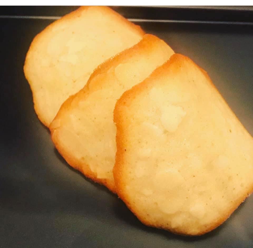 Quand le bord des tuiles commencent à être doré, décoller de la plaque avec une spatule et déposer sur un rouleau à pâtisserie afin que les tuiles prennent une forme arrondie .