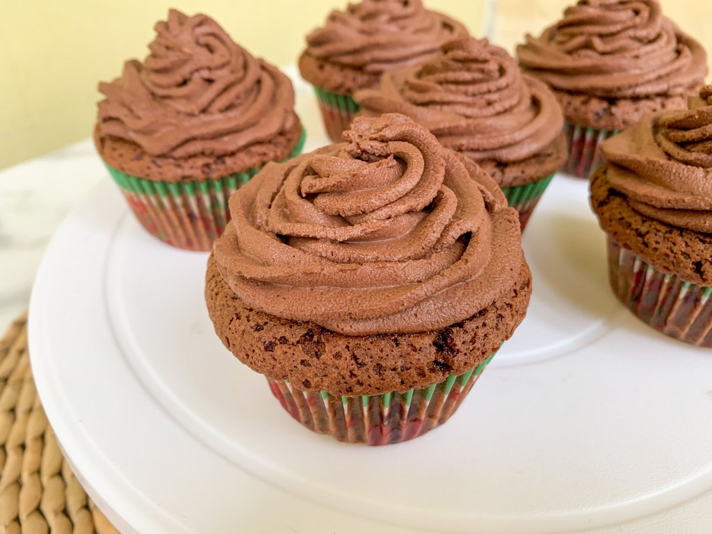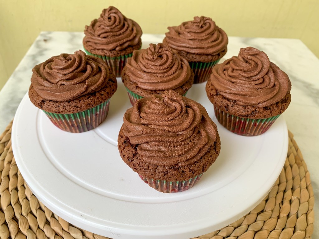 Ingrédients pour 12 cupcakes : 125g de farine, 100g de sucre, 10g de levure chimique, 200g de chocolat noir, 4 œufs, 125g de beurre.