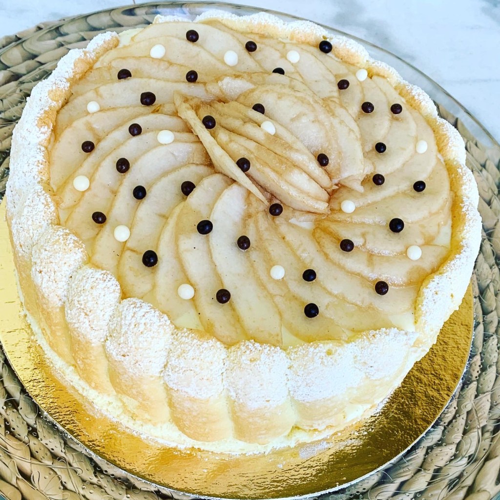 Elle est composée d’une pâte sucrée , d’une crème d’amandes aux pépites de chocolat, de pommes et décorée de perles en chocolat.